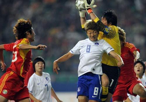 因为中韩两队前两场比赛的进球数和丢球数都一样,因此进行点球决定小组头名。门将张越第一个主罚点球命中,金度研主罚得手,双方1-1平。翁新芝主罚击中横梁下沿弹进球门,金娜莱打进右下角,2-2。徐媛轻松命中,田佳艺同样轻松命中,3-3平。庞丰月第一罚被门将扑出,但主裁示意门将提前移动,庞丰月重罚将球踢飞,柳志恩同样将球射偏。刘华娜将球打进死角,池笑燃轻松命中,双方4-4平。袁帆抽射进死角,李银美同样命中,5-5平。王一航推射命中,权丙娜轻松得手,双方6-6平。周高萍高弧线球命中,洪庆淑命中,7-7平。屈姗姗射门被扑出,柳英雅命中,中国7-8输球。